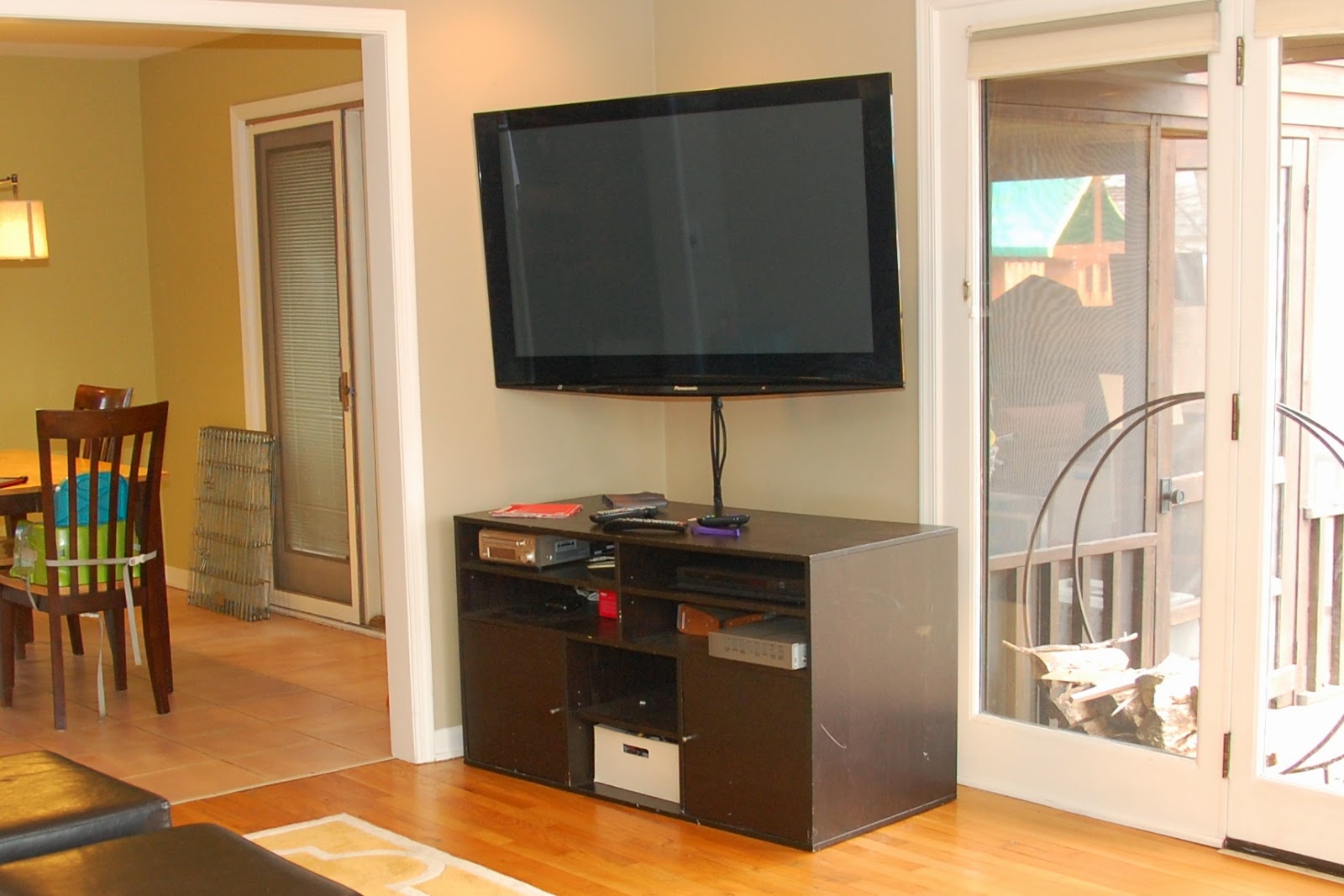 we've got the tv on a swivel mount in the corner. the corner is too small to mount the tv flush against either wall. and b/c of the room layout, this is really the only place the tv will work. so not ideal, but we are working with it. mounting the tv at an angle is working out great, we just need to figure out the wires mess still. and the tv stand needs replaced. this old one we had is 1. ugly and 2. too big.